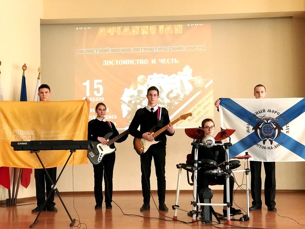 20 февраля 2019г. вокально-инструментальный ансамбль «Возрождение» Ростовской региональной общественной военно-патриотической организации «Молодежный морской клуб» принял качественное участие Областном Форуме «Достоинство и Честь», посвященном Дню памяти воинов-интернационалистов, исполнявших интернациональный долг за пределами границ своей Родины. Его проникновенный художественный номер « В руках автомат» определил флотскому коллективу первое место в номинации «А память сердце бережет» среди 37 образовательных учреждений профессионального образования Ростовской области. Напомним, 15 февраля 1989 г. последняя колонна советских войск покинула территорию Афганистана. Это событие ознаменовало для Советского Союза окончание Афганской войны, которая продлилась почти 10 лет. Это - праздник, но очень грустный. Его отмечают участники десятилетней необъявленной войны, офицеры, генералы, солдаты, прапорщики, старшины, а также и те, кто погон не носил, но был там и наравне с военными людьми рисковал жизнью, врачи, преподаватели вузов и другие гражданские специалисты обоих полов. У каждого, кто сражался там, остался в памяти свой Афганистан. В этой войне были примеры воинской доблести и интернационализма, проявления любви к Отечеству, готовности людей отдать свою жизнь делу защиты добра и справедливости. Сохранение исторической памяти о героическом прошлом нашего Отечества, формирование патриотического национального самосознания на примере героических подвигов наших предков и сверстников является стратегической задачей Донской флотской молодежи. Председатель РРВПОО «Молодежный морской клуб», Руководитель направления «Юнфлот» Штаба Ростовского регионального отделения Всероссийского детско-юношеского Военно-патриотического общественного движения «Юнармия А.Н.Лазарев