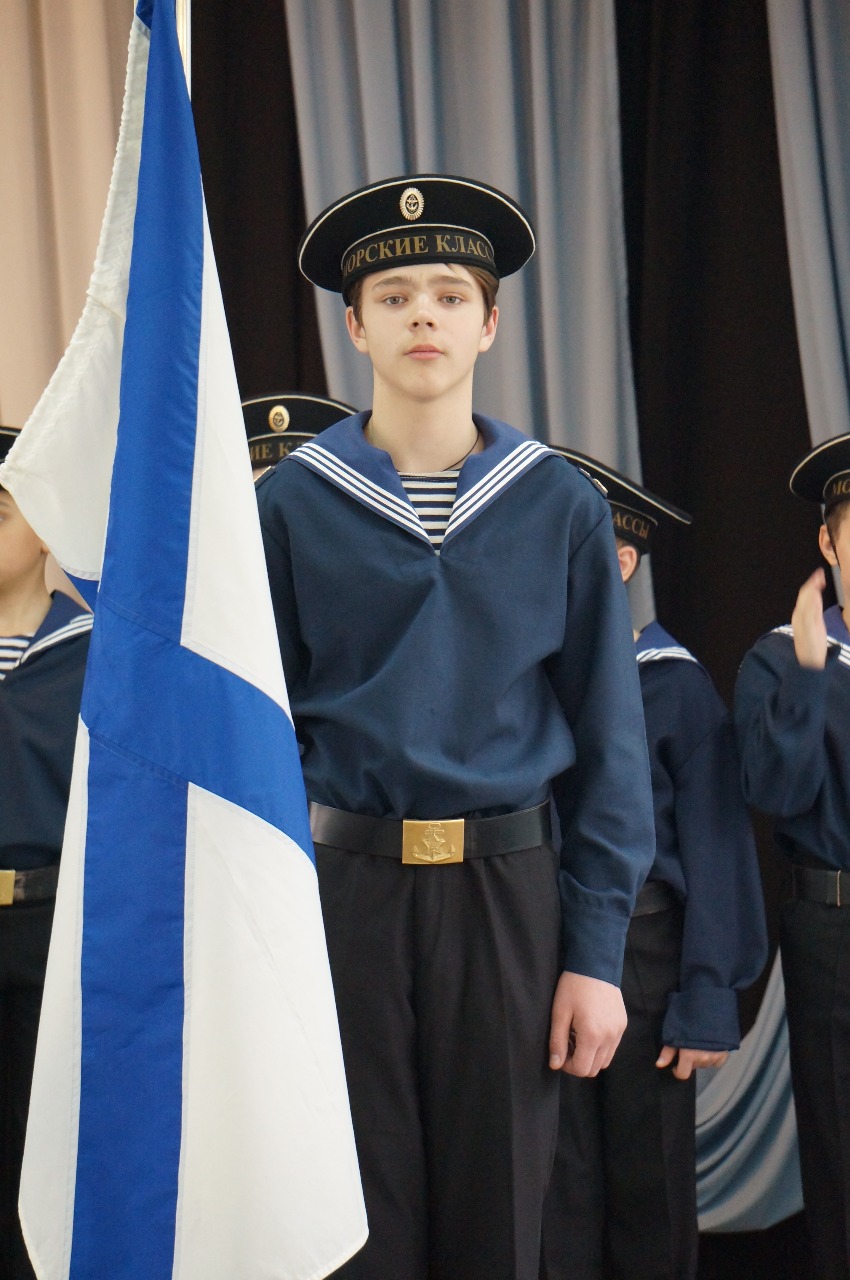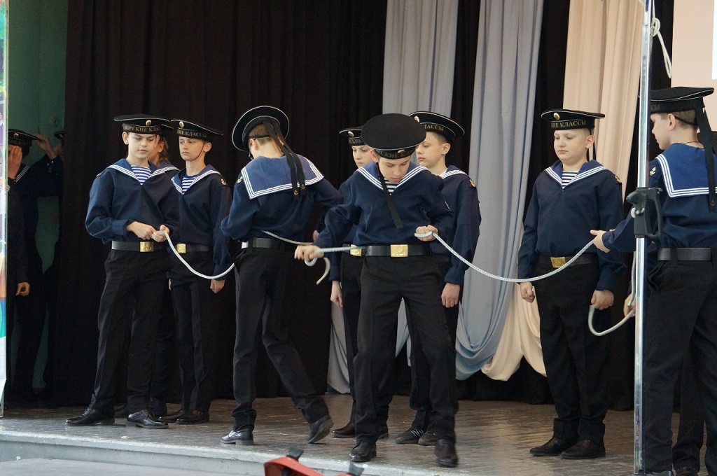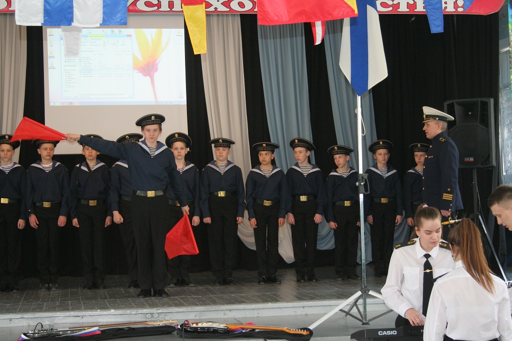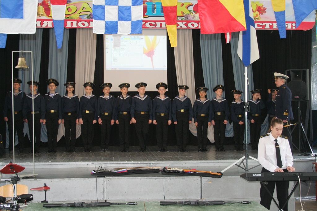 Парадный строй курсантов морского класса МБОУ «Школа №37» в актовом зале, украшенном флагами расцвечивания Военно-морского флота, торжественный подъем Андреевского флага, показные номера по общевойсковой и морской подготовке, завершили задушевным художественным номером вокально-инструментального ансамбля «Возрождение» РРО ВПО «Молодежный морской клуб».